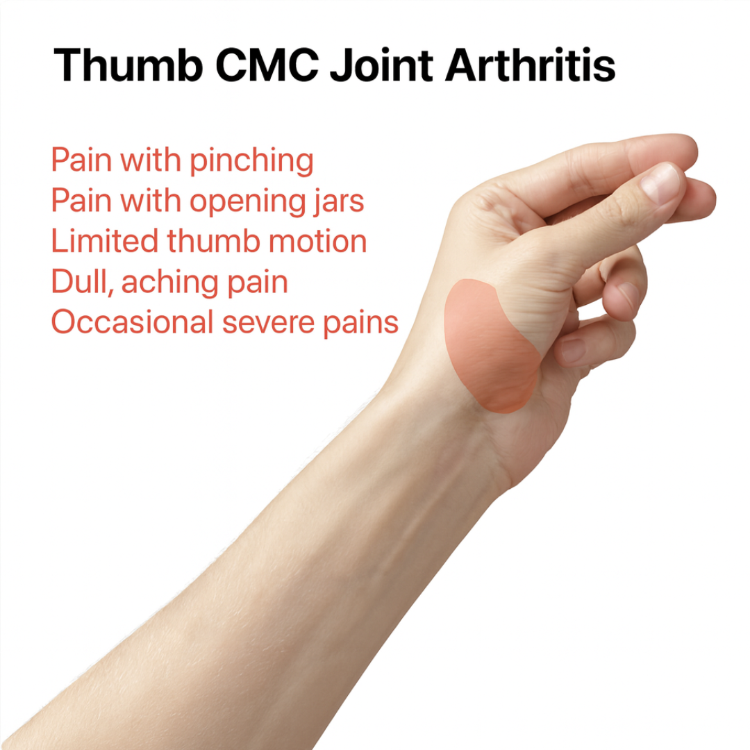 CMC Arthritis: Pain, stiffness, and grinding sensation specifically at the base of your thumb from worn cartilage