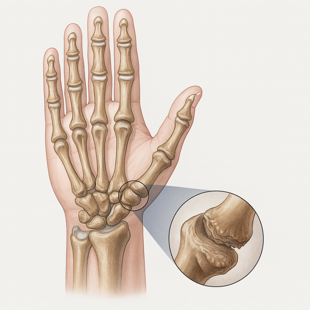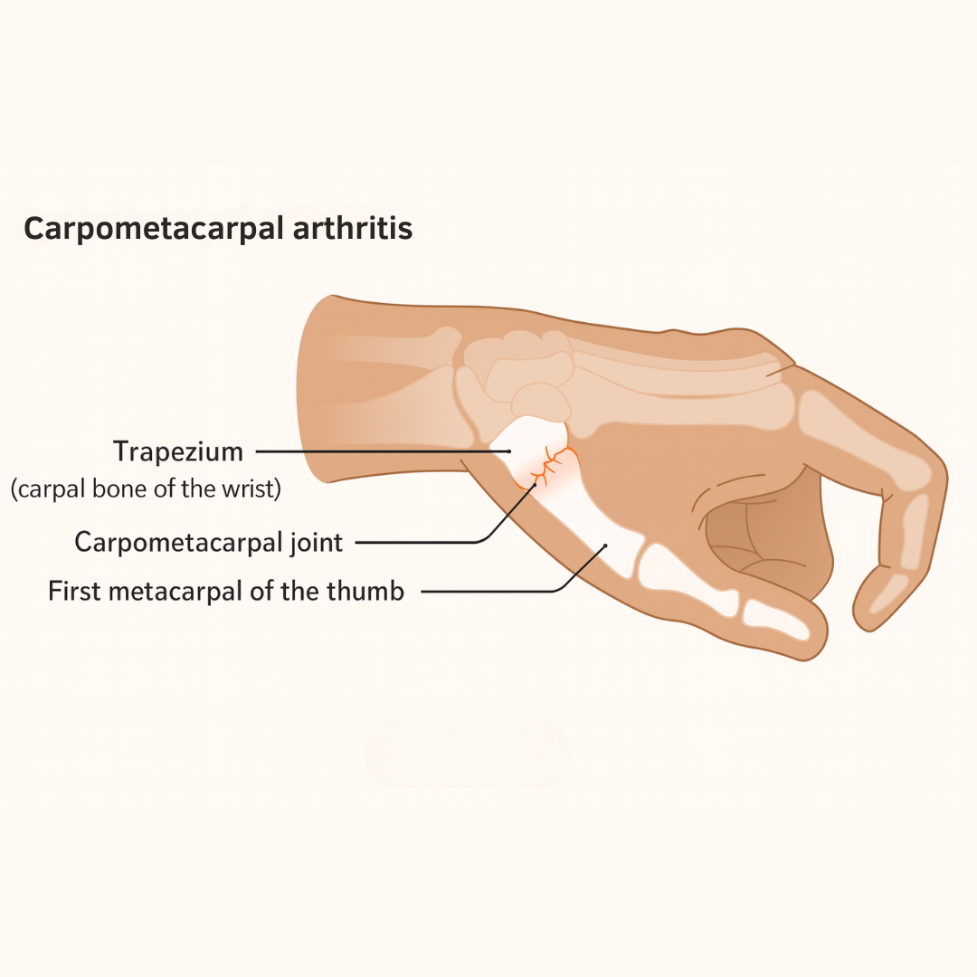 CMC Arthritis: Pain, stiffness, and grinding sensation specifically at the base of your thumb from worn cartilage